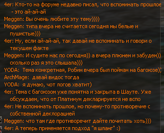 Второе. На мой личный взгляд, как ни странно бы это не прозвучало, но почему-то у нас все считали, что это не просто значок над головой, а знак того, что мы единый коллектив, а в едином коллективе не принято "выносить нижнее бельё на показ" и если что-то не нравится или не устраивает, то это либо обсуждается голосом, либо в ПМ, накрайняк в Клан-чате или Алли-чате. В коллективе не принято "поливать друг друга говном", а уж тем более всем на показ.